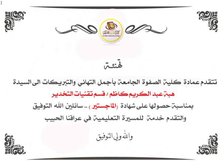 تبارك وتهنئ كلية الصفوة الجامعة التدريسية في قسم تقنيات التخدير ( هبه عبد الكريم كاظم ) بحصولها على شهادة الماجستير في اختصاص الفسلجة من كلية الطب البيطري / جامعة كربلاء بتقدير امتياز