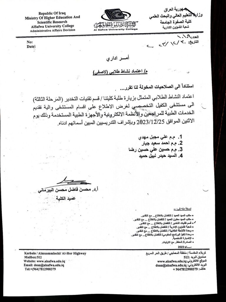 زار كادر وطلاب قسم تقنيات التخدير في كلية الصفوة الجامعة مستشفى الكفيل التخصصي وذلك للاطلاع على اقسام المستشفى واليه تقديم الخدمات الطبية للمراجعين والانظمة الالكترونية والاجهزة الطبيىة المستخدمة
